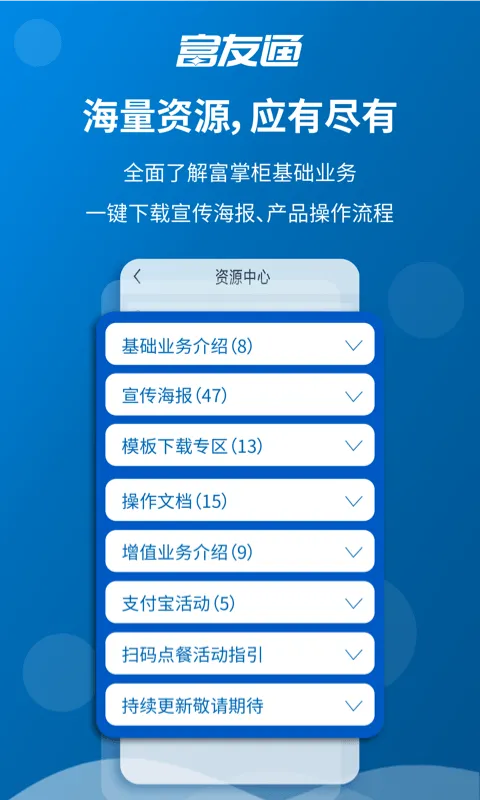 富友通最新手机版是服务业务员的现场录单工具,涵盖商户管理、待办管理等功能。能实时掌握公告,监控商户交易,提供便捷进件方式,还有多种亮点功能,优化体验,助业务员高效提升业绩 。