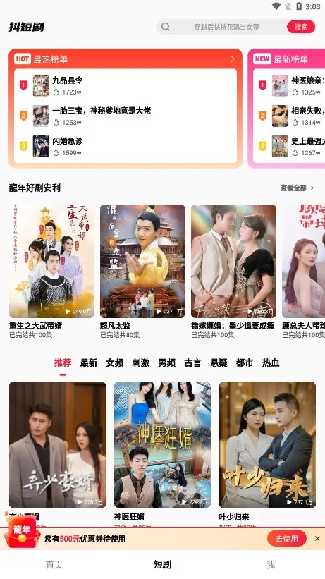 抖短剧安卓版手机版能为用户带来出色的短剧观看体验。它内容丰富多样,涵盖男频赘婿穿越、女频现言古言等各种题材。播放体验佳,竖屏浏览沉浸式,无广告干扰,播放清晰流畅。支持自由搜索,上百万短剧免费看,还能一键解锁全集。具备智能推荐,精准匹配用户喜好。可自定义播放列表,有完整版短剧随时看。而且有领先下载技术,能免费下载到本地离线观看。操作简单,新手也能快速上手,是一款值得使用的短剧软件 。