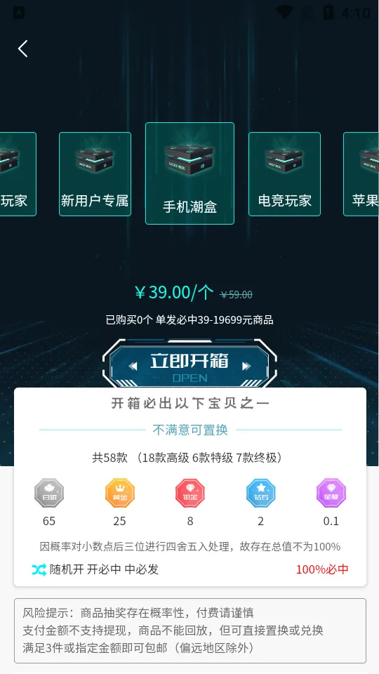 越光宝盒是潮流购物商城,每天有盲盒新品。在质量上,严格筛选供应商,确保商品高品质,潮流玩具、精美饰品等好物都能找到。购物体验极佳,一键下单,不受时空限制,支持多种支付,安全有保障。还定期有优惠活动,让购物更实惠。它有独特比价功能,能选性价比最优商品。商品均为正品,有保障。界面极简,操作轻松,小白也能快速上手。此外,魔盒抽奖增添购物乐趣,精选优质潮流好物,保持新鲜感 ,还有积分系统可兑换好礼。