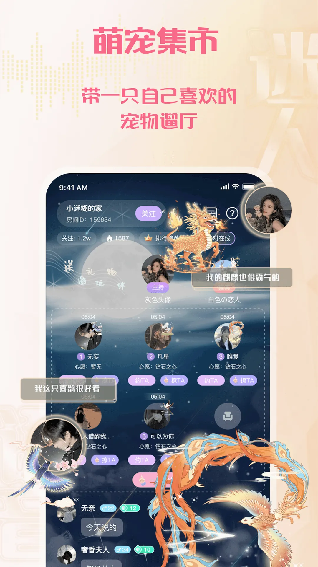 2、玩法多样独特:有蒙面秀场、宠物集市、伯虎点秋香等特色玩法。能在蒙面秀场展示才华,领养萌宠遛厅,体验有趣的互动。