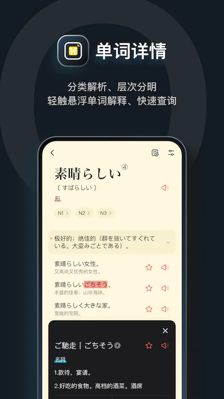 2、多维度解析:支持例句假名罗马音等多维度解析,自动标注单词活用形态与固定搭配,搭配真人发音强化记忆效果,助力更好理解和掌握。