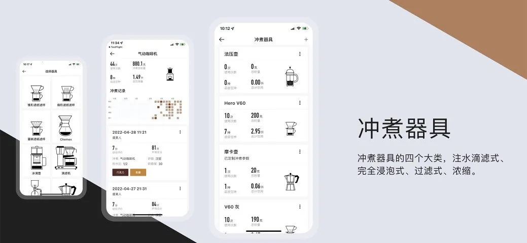 1、记录全面:从咖啡豆、冲煮器具、研磨器基础数据,到冲煮器材设置、水温等参数,系统记录每一杯咖啡冲煮过程。