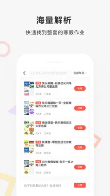 2、查找快:支持扫描条形码、按书名、年级、学科、版本等多种方式搜索,能迅速定位所需学习资料,秒出全本解析。