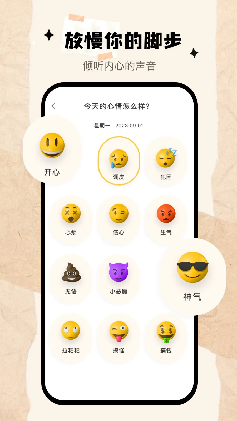 <1>**独创设计**:拥有独特的心情转盘设计,可直观表达每日情绪,留下专属情感印记。