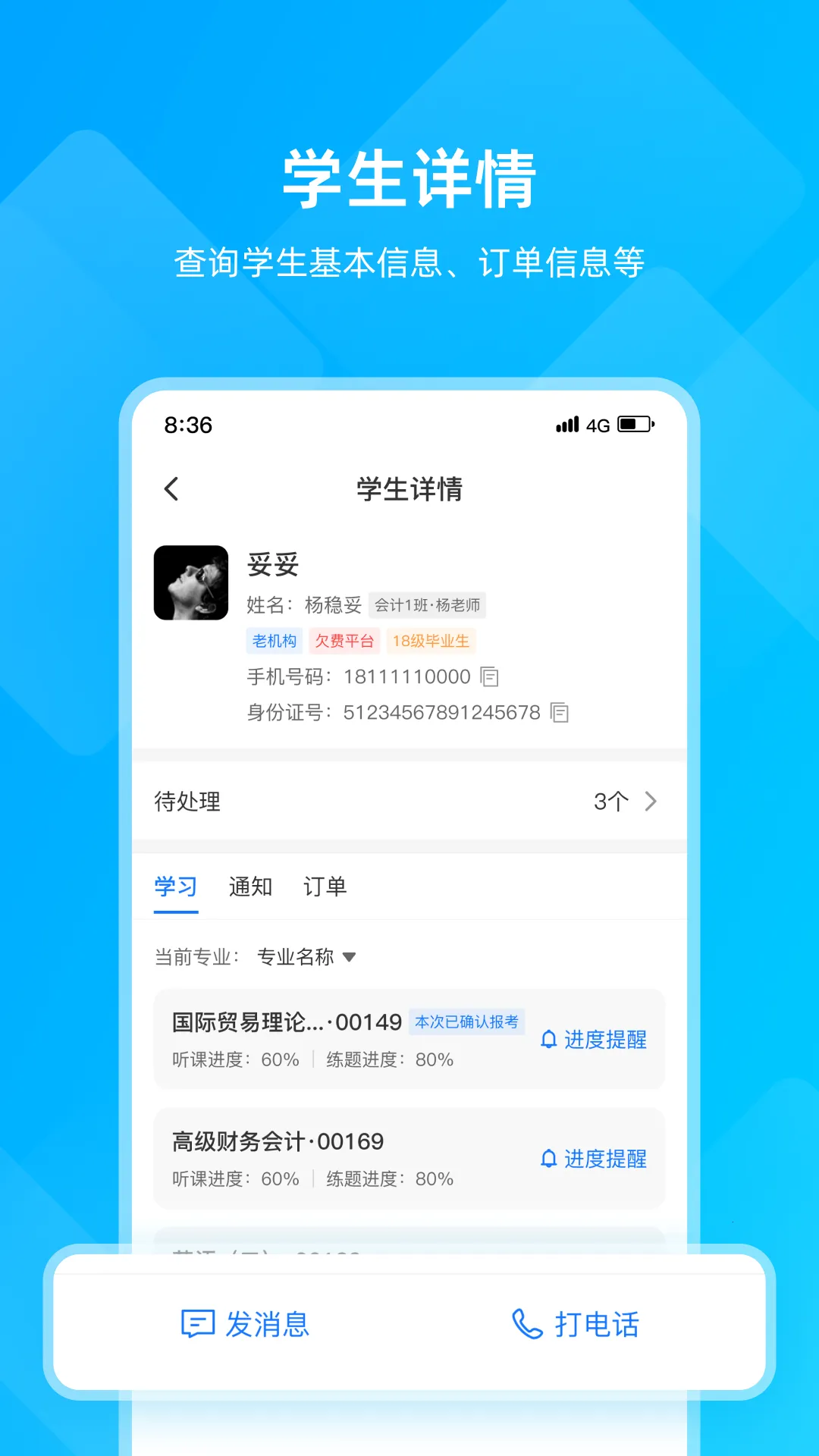 2、提供深度学情洞察,教师可即时掌握学生基础信息、订单详情及完整学习记录,从而精准评估学习需求,制定个性化教学方案,显著提升教学效果。