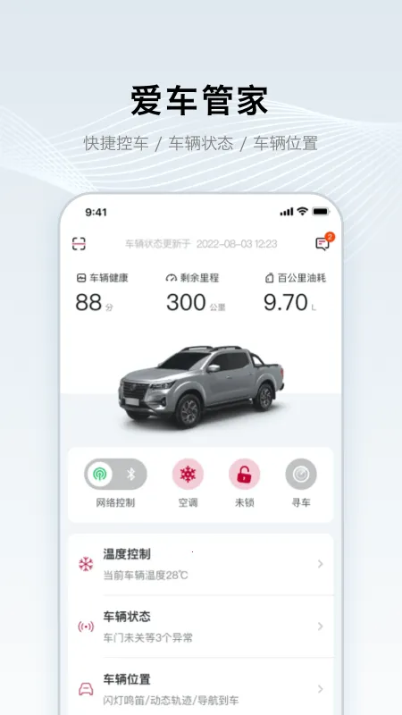 2、实时掌控:可随时查看车辆位置、状态,包括车门开闭等,车辆状况尽在掌握。