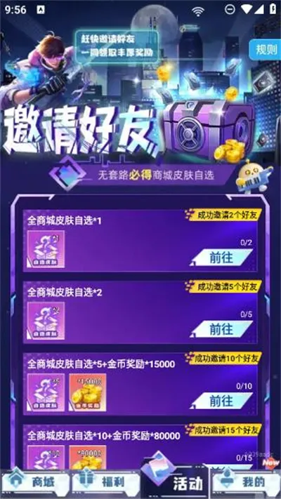 1 福利丰富多样,不仅有海量精选皮肤福利与超值礼包,每天还有定时活动,包含限时折扣、限量发售、双倍奖励等,更有签到奖励、轮盘抽奖等,为用户带来诸多惊喜。
