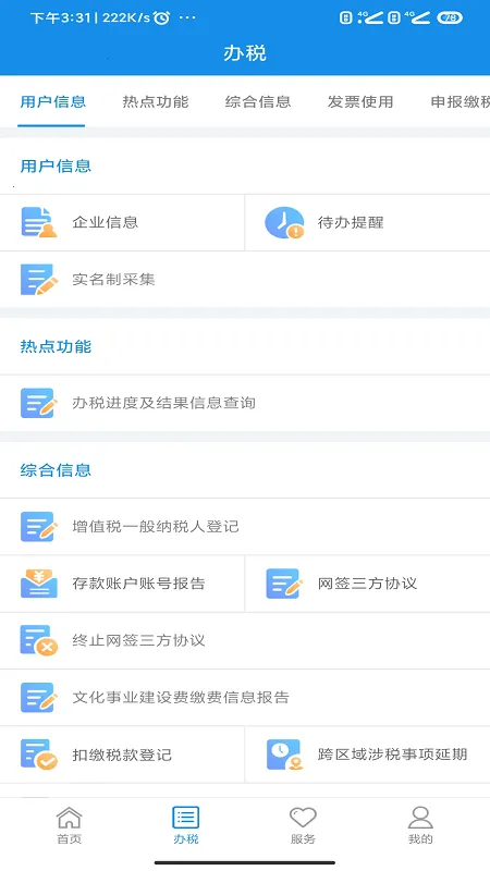 1、功能全面:涵盖了综合信息报告、发票使用、纳税申报、税费缴纳、证明开具等众多涉税事项,还支持社保费业务办理、城乡居民保险缴费等,无论是社会公众、自然人还是企业人员,都能满足其多样化的税务需求。