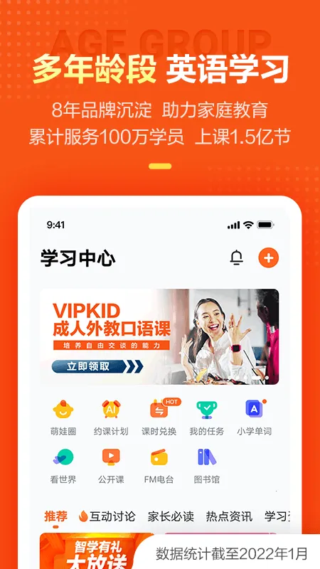 VIPKID英语最新手机版专注4 - 15岁青少儿英语教育,超50万学生、7万多纯北美外教1对1在线授课。运用浸入式教学,结合AI大数据,课程对标CCSS标准。多终端上课,还有翻转课堂、成长伙伴等特色。