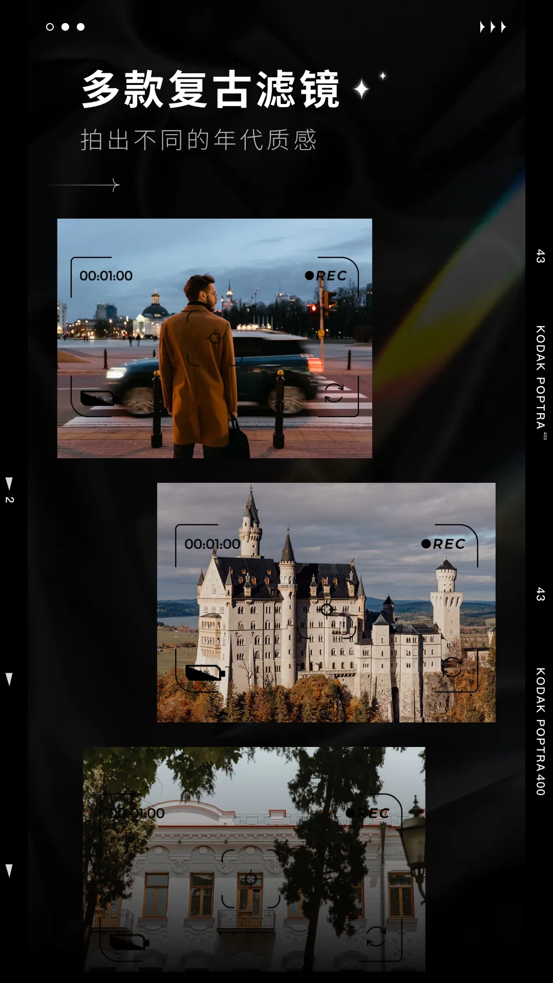 3、风格多样:支持拍摄各种规格复古胶片、复古视频,还支持多种现代风格数码相机色彩还原,能打造多种风格照片,带来丰富的拍摄体验。