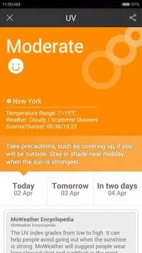 2、功能丰富实用:有空气质量实时监控、天气灾害预警、明星穿衣助手、智能对话框等特色功能。空气质量指数界面升级,五天内逐小时精准预报;天气灾害预警能及时提醒异常天气并提供防御指南。