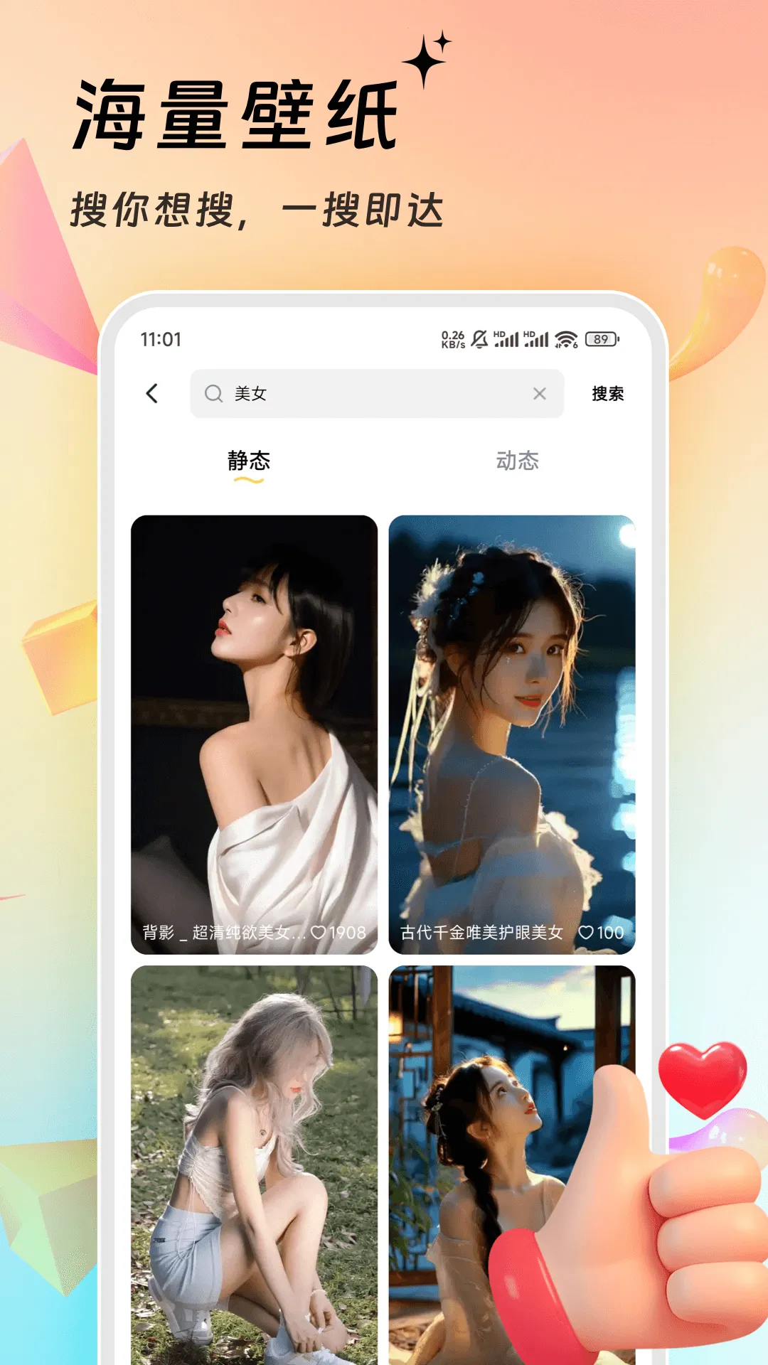 使用起来也很方便,上下滑动就能快速切换壁纸,遇到喜欢的一键收藏,随时查看复用。而且资源总量庞大,还会自动更新全网热门壁纸,让你长期有新鲜壁纸可换。有了它,手机美化超简单,赶紧试试吧。