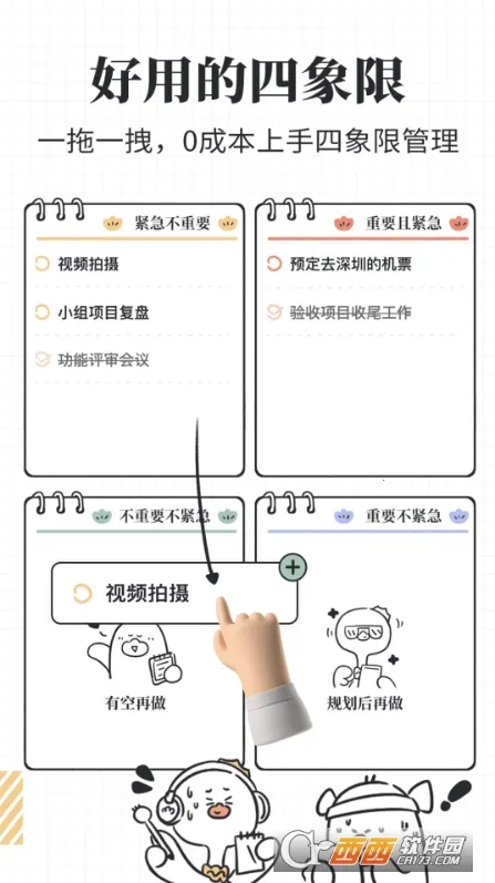 1、科学管理时间:采用四象限列表科学管理时间,能帮助用户分清任务的轻重缓急,合理安排工作和学习任务。