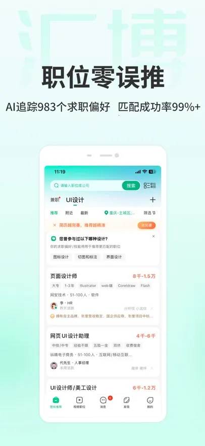 汇博招聘最新手机版是专为求职者打造的招聘应用。覆盖多热门行业,职位丰富,能精准匹配。经人工六重审核,真实靠谱。支持多种求职功能,设计简约,更新后优化推荐、新增视频职位等,助你高效找到心仪工作。