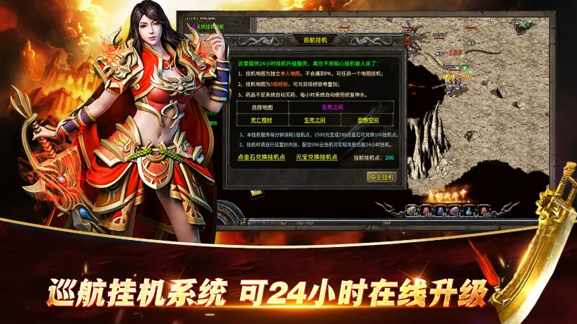 游戏优势独特,所有怪物可爆龙年大吉类字用于抽取天命或合成材料;参与活动得积分可免费兑换骷髅时装;能获得多种BUFF增加乐趣;抽取天命可得打怪刀刀绿毒等属性,法战也能单挑BOSS;还可任意转职,装备和技能随转;支持巡航挂机,配合996云挂机可24小时挂机练级。