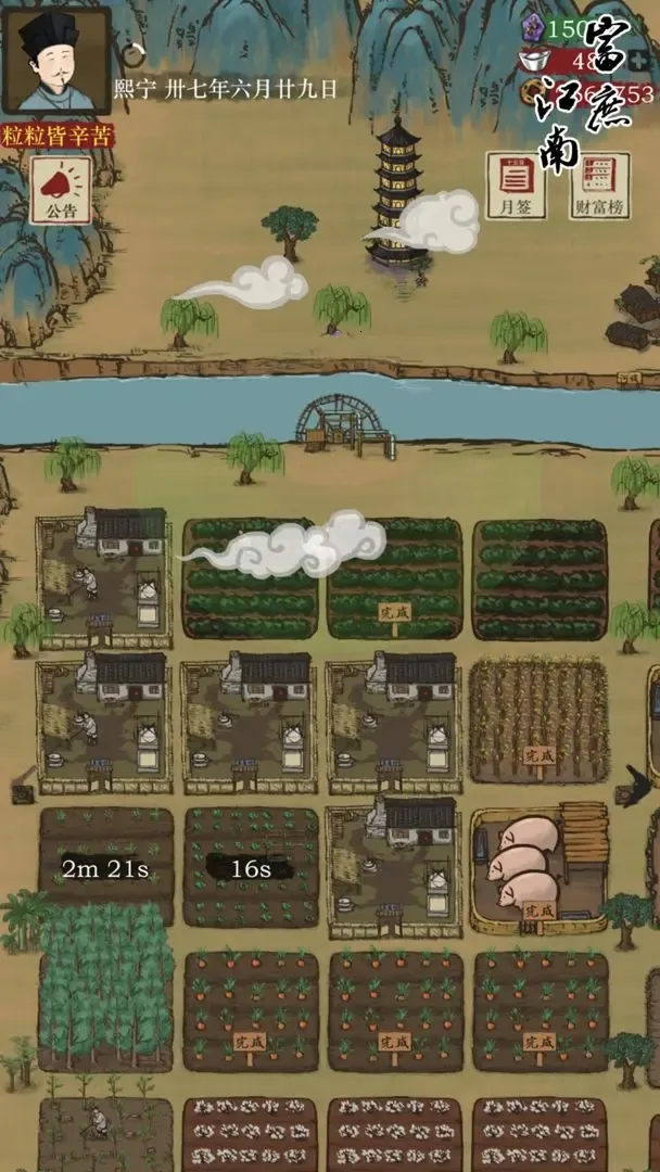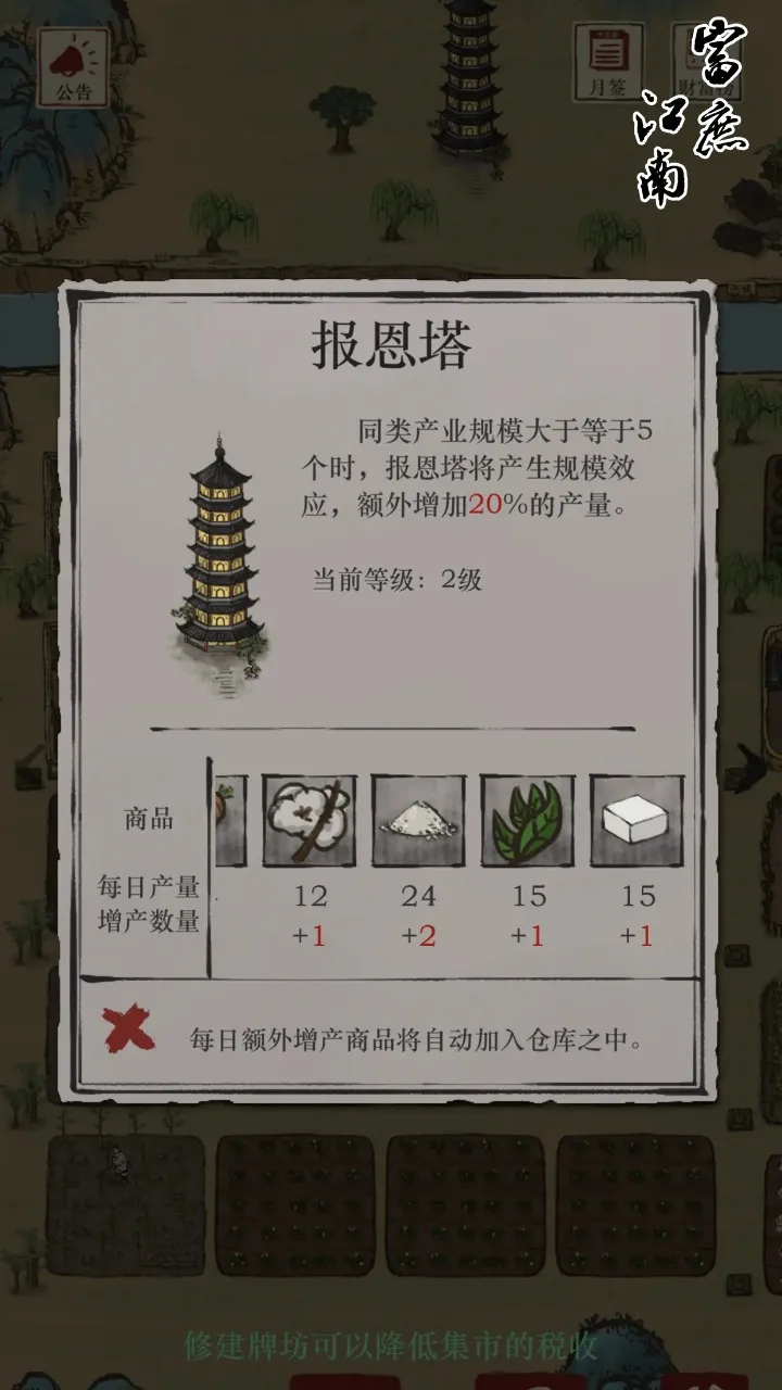 游戏优势满满,能雇佣并管理大量劳动力,确保生产设施高效运转。查看财务账目,清晰掌握收支与盈利状况。逐步解锁更多农田,丰富产品种类。提升仓库存储等级与容量,把握出售时机获利。快来《富庶江南》,描绘你的发展蓝图,体验经营的乐趣吧!
