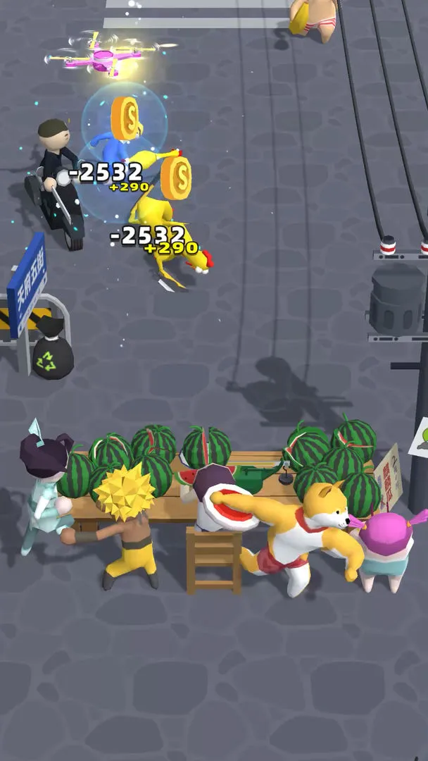 1、角色丰富:提供卖瓜人和买瓜人两种角色可选,还有众多不同帮手,如水枪熊孩、鸽子大叔等,可自由搭配阵容。