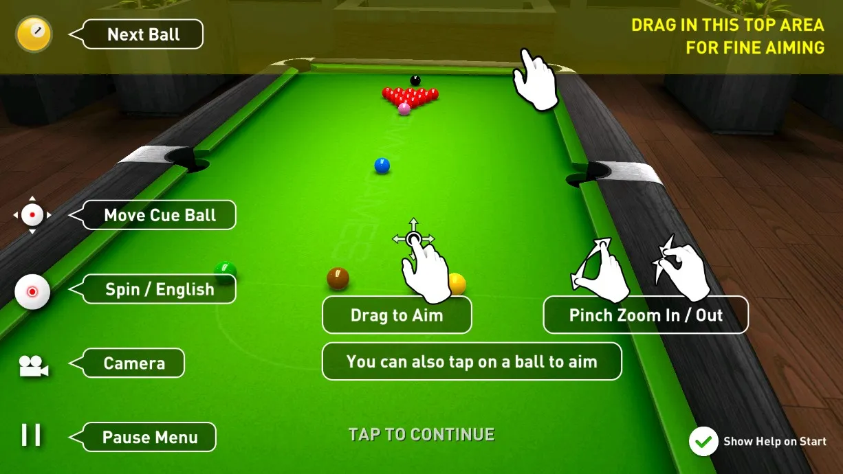 3、点击开始按钮进入球桌界面,系统将按照标准斯诺克规则自动完成初始摆球流程。