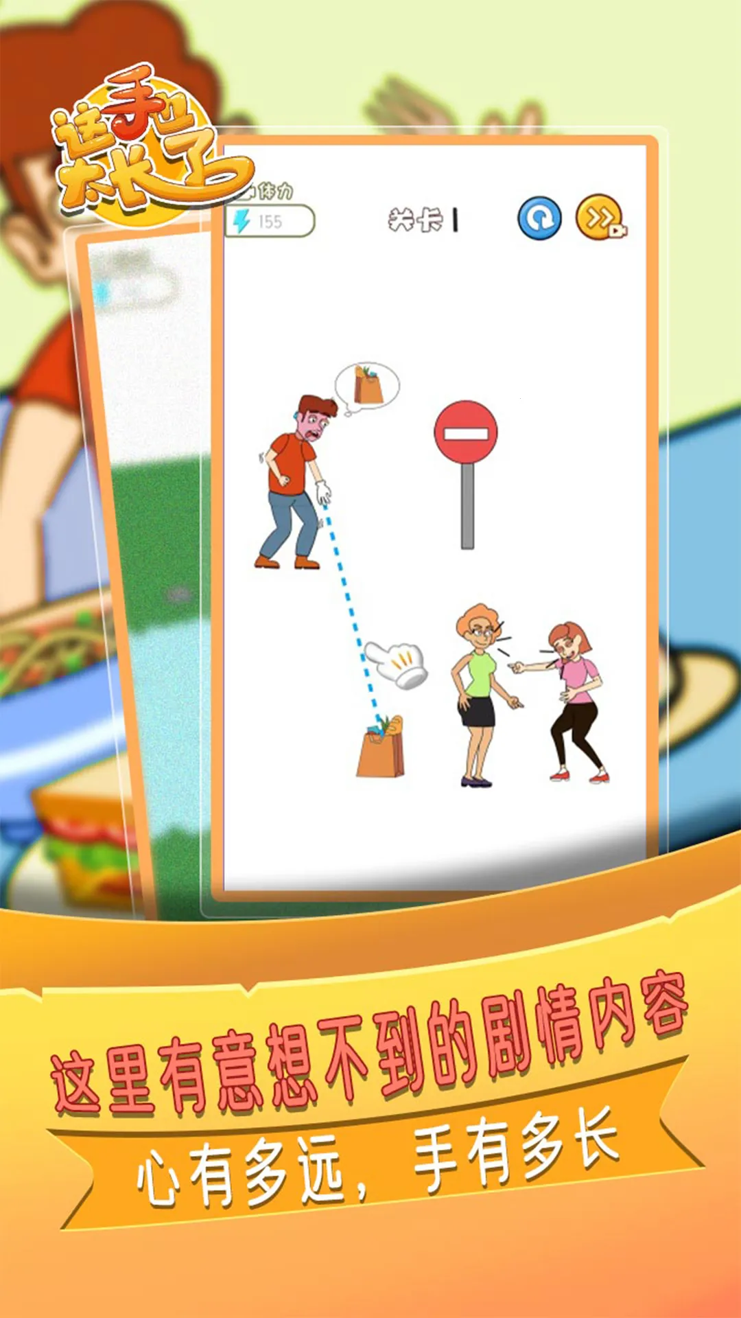 这手也太长了是一款趣味解谜闯关游戏。玩家操控超长手在卡通环境闯关,通过思考解决困难、收集物品通关。无广告,画面清新,操作简单,随时能玩,有多种障碍与道具,玩法魔性解压。