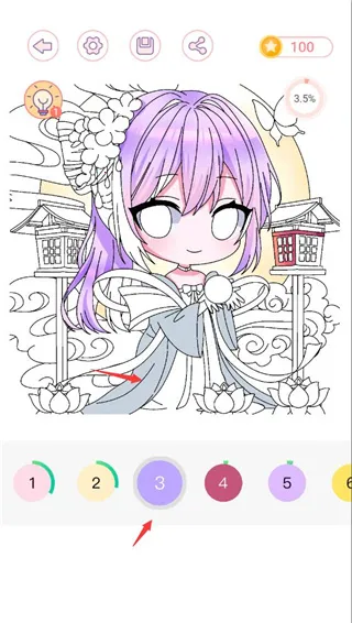 6、选择箭头符号可以返回,第三个可以保存当下涂色,第四可以分享给你的小伙伴分享。