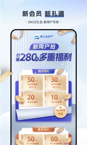 4. **新客礼包超值**:新用户在首次登陆APP时,即可获得价值280元的新客礼包,包含酒店、锦江会员商城提供的超万款商品,订房购物时享受立减优惠。