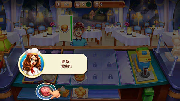 进入游戏后,选择任意关卡即可开启挑战。每个关卡均设有明确目标,例如“为5位顾客供应汉堡+可乐”或“在90秒内完成8份订单”,点击“玩游戏”按钮即刻进入厨房战场。