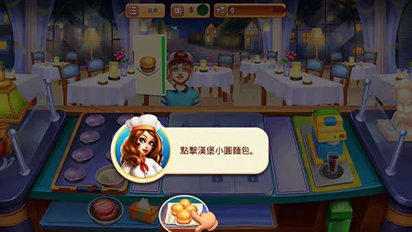 开局界面会清晰展示当前顾客需求。例如第一位顾客点单“汉堡”,你需按顺序操作:先点击底部“小圆面包”作为基底;再点击左下角“汉堡肉”,进入烤制状态;待肉饼边缘微焦泛光,点击即可取出并叠放在面包上;最后点击已完成的汉堡,迅速递出完成服务。