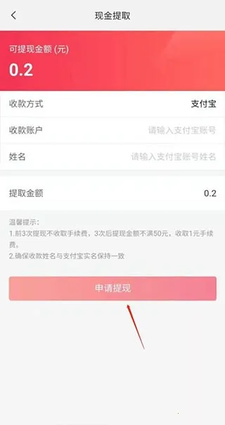 进入返现详情页后,点击「提现」按钮,根据提示输入需要接收返现金额的支付宝账号及真实姓名,确认信息无误后提交申请即可完成提现。