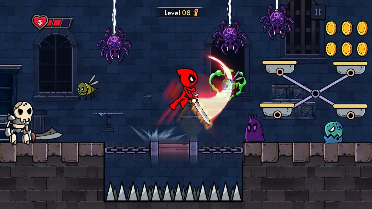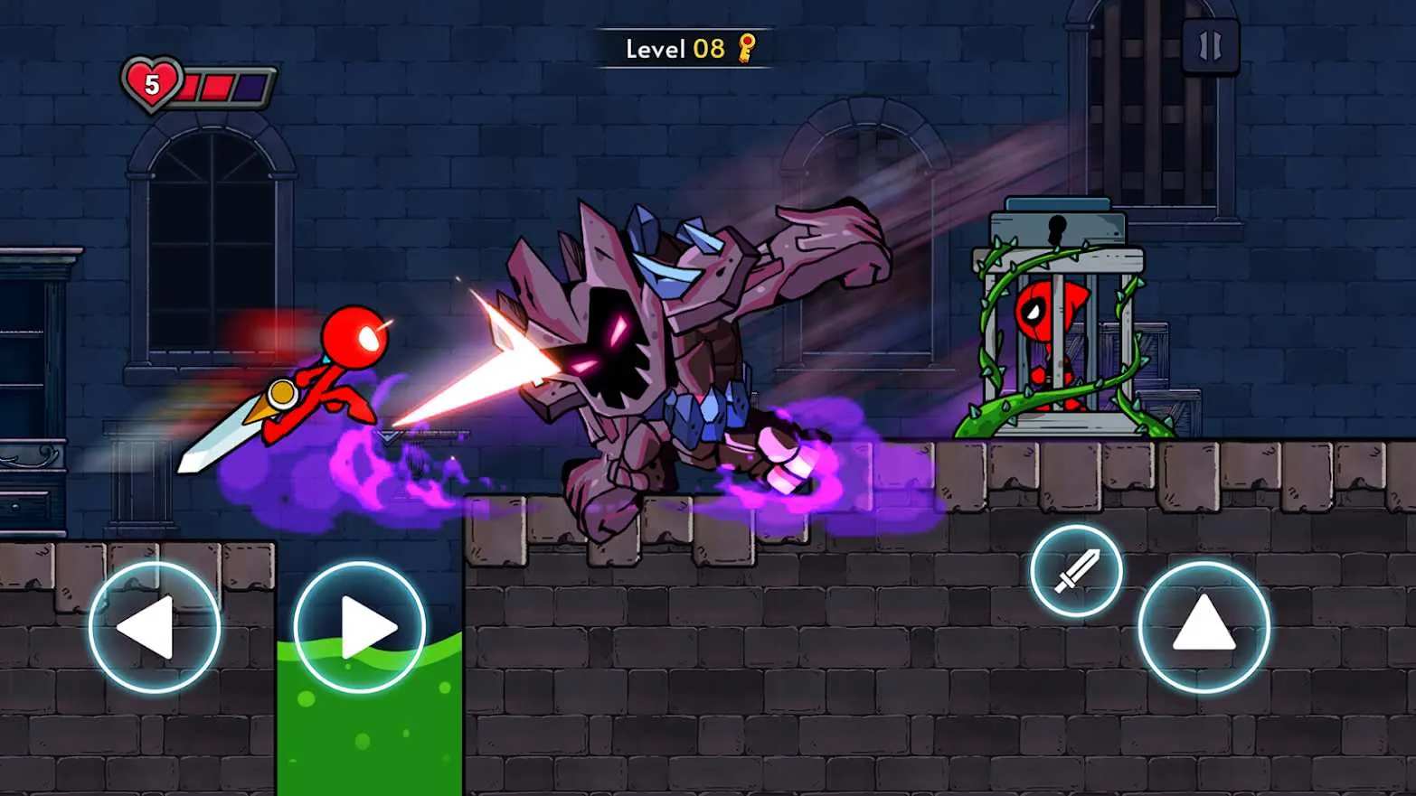游戏拥有诸多好玩关卡,趣味十足,精彩缤纷。玩家能够操控红色火柴人穿越森林、沙漠、城堡等各种环境各异的地图,每个关卡都精心设计了各种陷阱、障碍和敌人等待挑战,带来丰富的冒险体验。