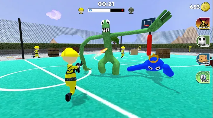 彩虹朋友捉迷藏(RainbowFriends:Hide)是冒险躲猫猫闯关游戏,有很多地图。玩家要躲避僵尸,可扮演人类用剑或枪对抗,也能成僵尸感染世界。玩法简单上瘾,3D图形,在线离线均可,每天有新挑战。