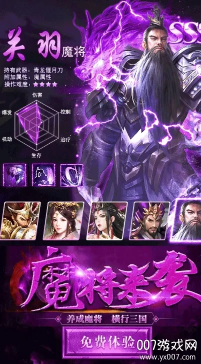 2. 有骁将、刺客和谋士三个职业,各职业倾向不同,有10个独立技能,部分技能升级效果变化,衍生多种玩法。