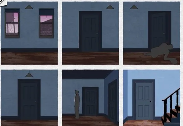 随后来到了第三个场景,倒霉的主人公在众多的房间当中穿梭,却不料RP不好,乱了阵脚,被守株待兔的警察给逮了个正着……如果我们按照下图移动插画的位置,主人公的RP爆表,错过了警察之后便可以从楼梯逃走。小编也不知道怎么回事,自从玩了致命框架攻略之后也忍不住站在了我们的主人公这边,明知与警察作对实则不对,却还是忍不住为逃过一劫又一劫的黑衣人拍手叫好。