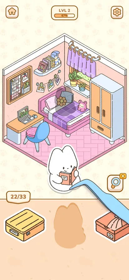游戏玩法超简单,关卡丰富。进入游戏后选个关卡,海量贴纸素材任你挑,直接拖进房间放在合适区域就行,还能随时切换。这里不仅有家具、植物,动物玩具饰品等各种贴纸,都能随心拖拽组合创作。每个关卡场景和主题都不同,像森林屋、蛋糕屋、儿童房等,每次装扮都有新鲜感,部分关卡还有时间限制,有点小刺激。而且操作简单,动动手指就能布置房间。布置好后可爱猫咪会入住,画面更生动有趣。每次完成装饰还能解锁新贴纸或新房间,越玩素材越多,超好玩!