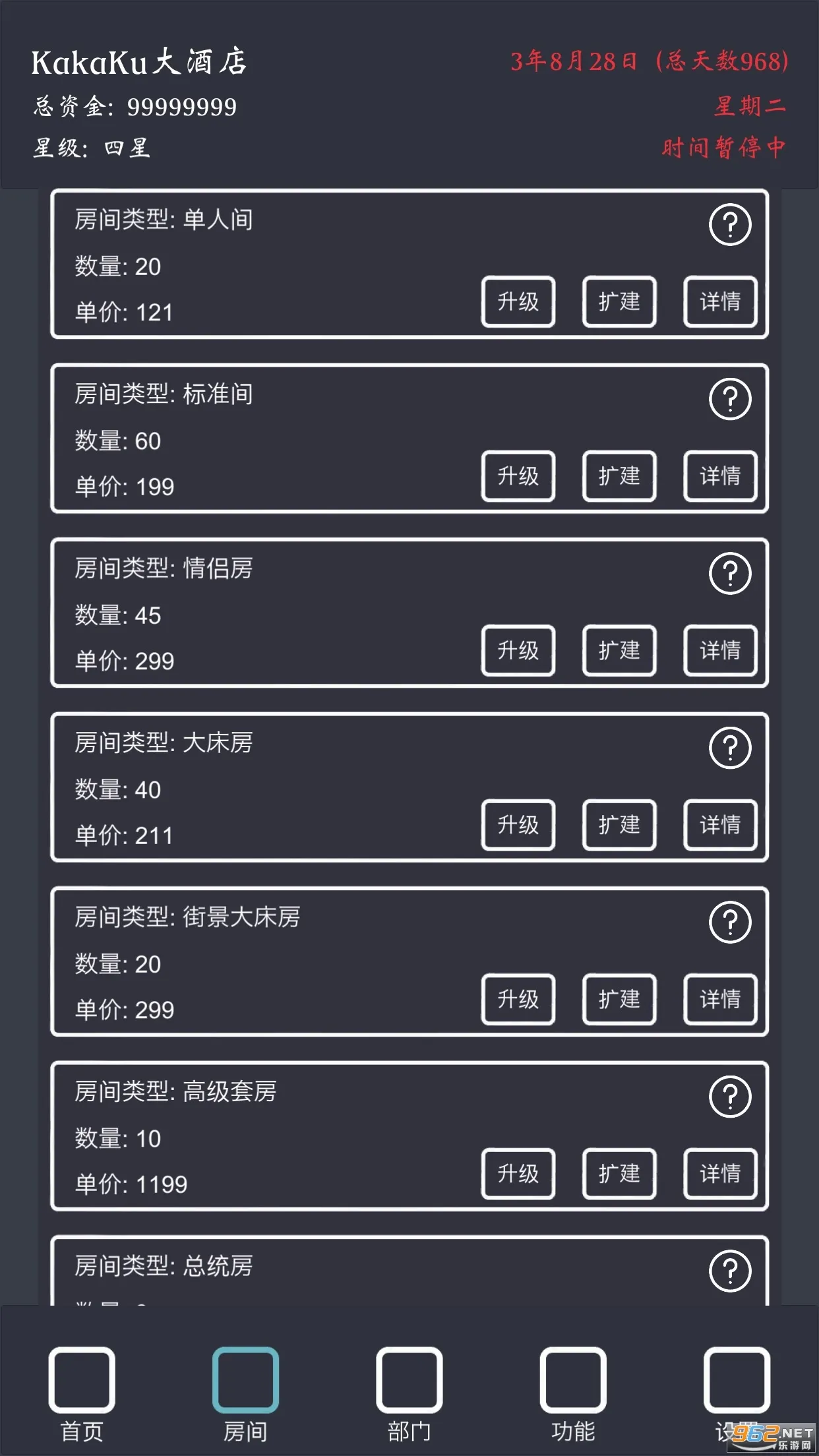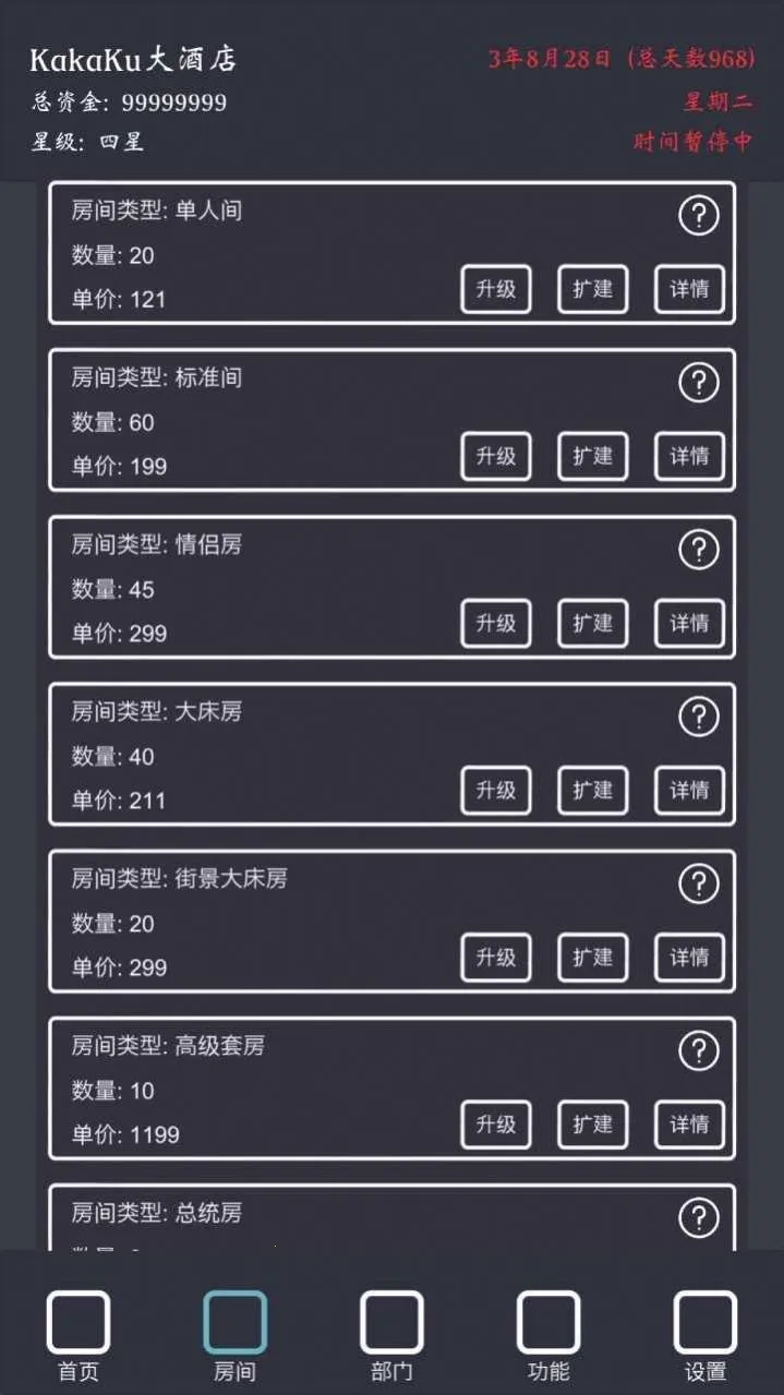说说我的玩法,初期别开套房、高级大床、行政套房、总统套房,我三星了这些也住不满,然后走量的单人、标间、情侣、大床、街景等切记别升级太高,升级高了房价提升影响入住率,钱多了就慢慢扩张那些走量的房型。