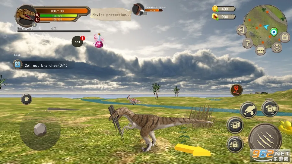 1、进入游戏,我们滑动屏幕可以看视野,左手变按钮控制走动,左上角是恐龙的状态,右上角是地图以及所在位置,右手边大按钮为攻击,其他分别控制头槌、咆哮、叼起、加速;