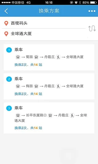 可查询附近公交站点可出行的线路及换乘信息等,还能提供多样合理换乘方案,满足不同出行需求。