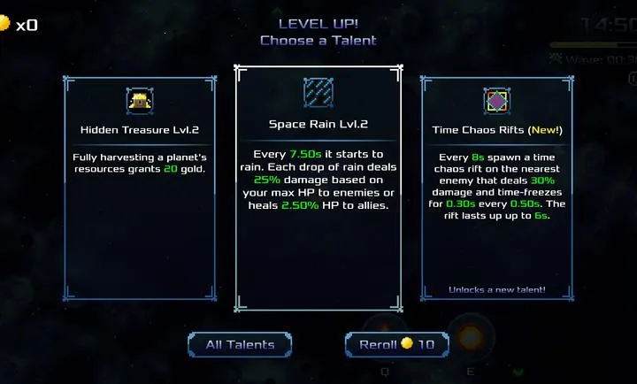 每波外星人进攻间隙能采集星球资源、与宇宙互动,为下一步行动做准备,策略性玩法丰富。