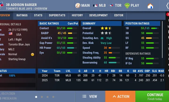 “外场棒球27GO(棒球模拟游戏)”是一款备受瞩目的游戏。它能让玩家无论身处何地,都可畅玩备受喜爱的OutoftheParkBaseball系列。游戏中,玩家可以随心选择球队经营模式,在单人游戏里运营自己心仪的MLB、KBO国际或虚构的棒球俱乐部,体验2026年MLB和KBO赛季等精彩内容。还能在完美球队模式中与全球玩家一较高下,打造属于自己的王朝。今年它新增了诸多内容,比如全新高级统计数据、全新难度设置、AI改进以及用户体验改进等。并且OOTP27Go!免费包含1934、1955和2008年的MLB历史赛季。对于喜爱棒球模拟游戏的玩家来说,它无疑提供了丰富且精彩的体验,无论是管理球队还是参与各种模式,都能带来十足的乐趣,**是一款值得尝试的棒球模拟游戏**。