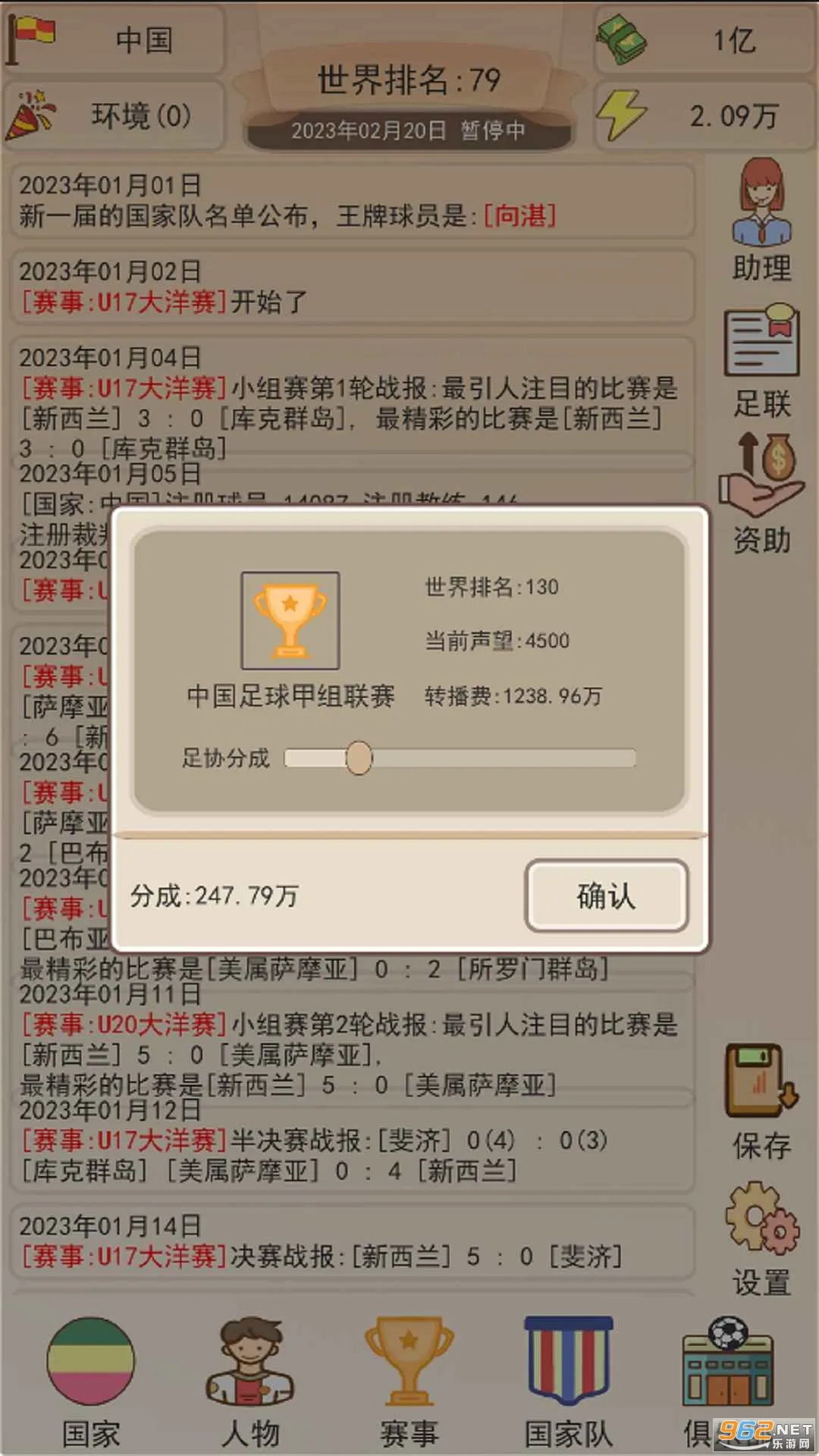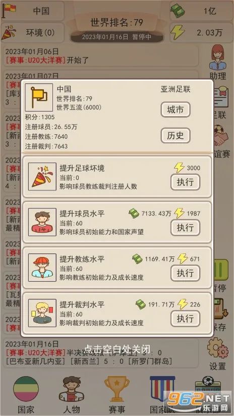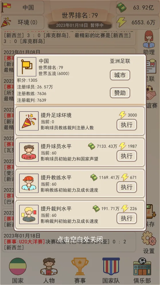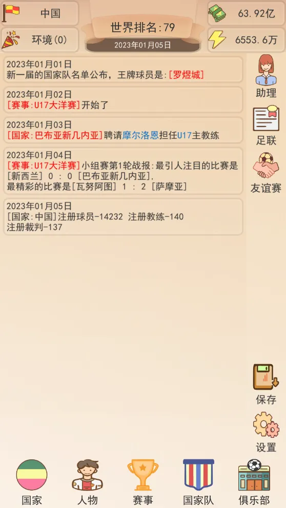 《足协模拟器》安卓手机版是一款放置模拟经营手游。玩家接手足协,规划经营内容,挖掘培养球员,举办赛事。以文字模拟,玩法简单易上手,包含丰富赛事与球星,还有自动保存功能,助你带领国足冲击世界杯 。