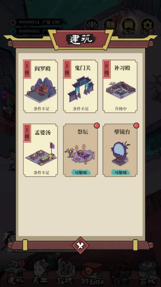 2、玩法丰富:可建造各种古风阴间建筑,解锁新剧情对话,规划布局改造十八层地狱,还有多样经营策略等。