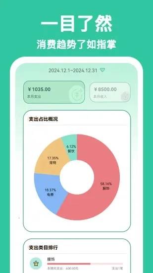 3、方便实用:支持导出多种格式账单报表,便于深入财务分析;提供定制化预算管理,助力用户养成良好消费习惯,合理规划支出。