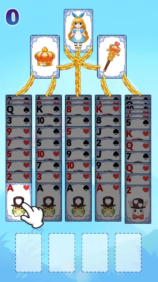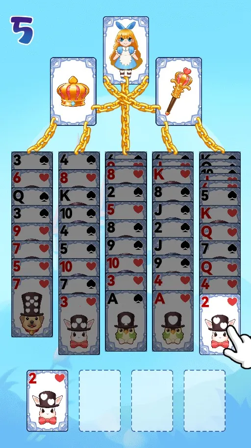 这款游戏巧妙地融合了蜘蛛纸牌与消消乐的元素,打造出一种全新的休闲体验。其核心玩法在于策略性的纸牌消除,你需要审时度势,从五列纸牌中选取合适的牌放入下方的四个空格,通过同点数消除来获取积分并解锁纸牌。