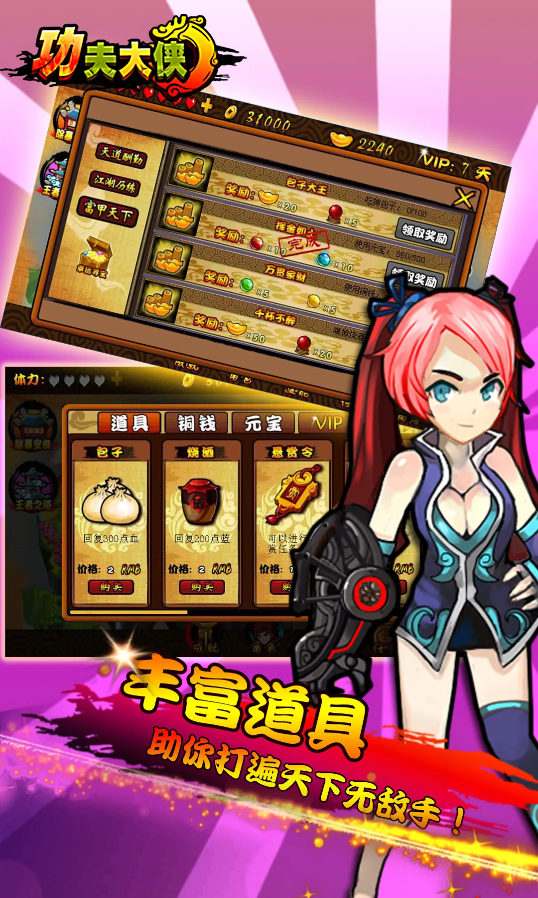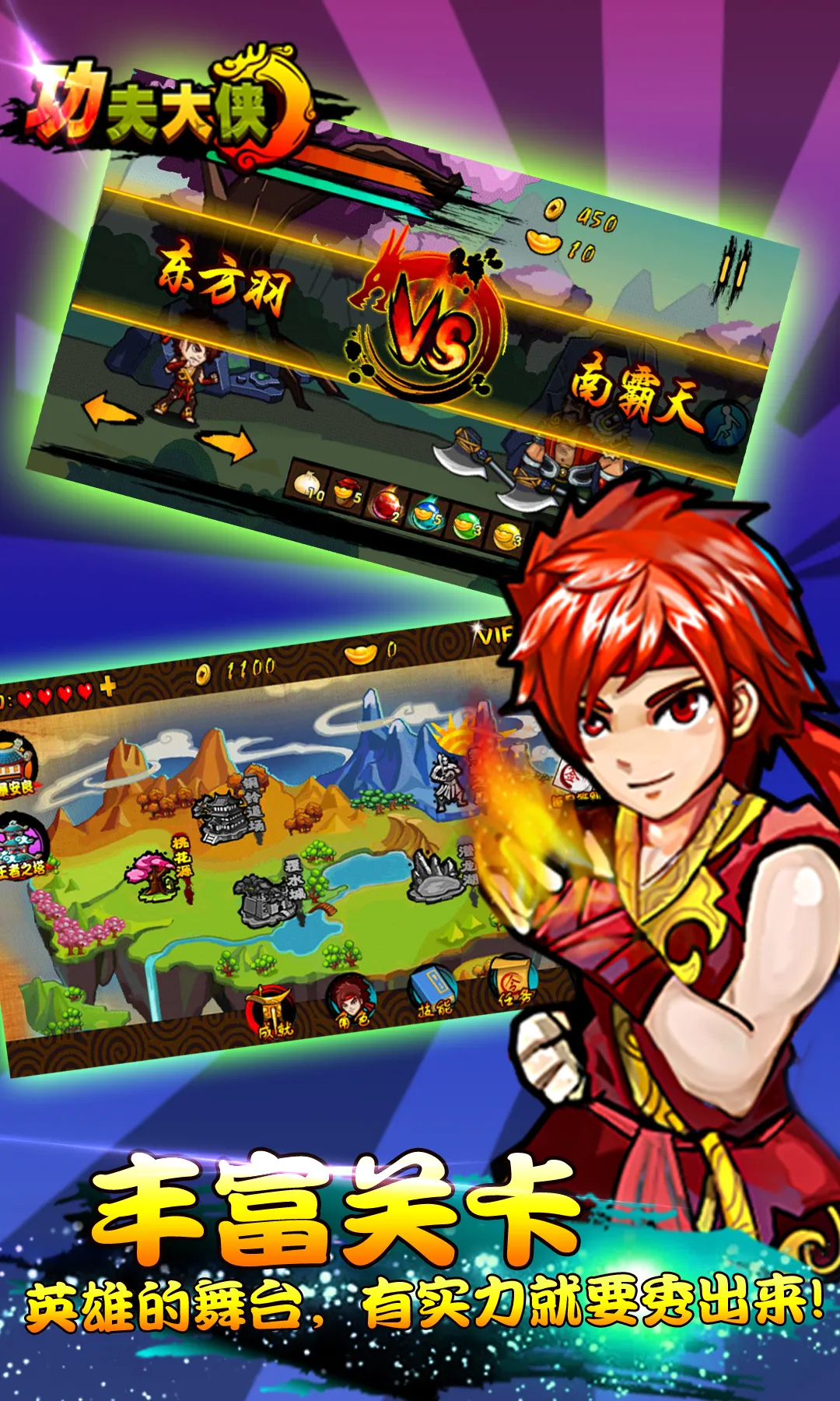 《功夫大侠》是横版格斗RPG手游,Q版亮丽画风,人物可爱立体。水墨场景,操作简单,招式酷炫。有丰富关卡、剧情,能选门派武器,还可挑战王者之塔,在战斗中圆玩家武侠梦 。