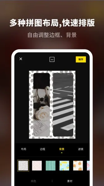 2、快速排版超便捷:提供6大拼图布局,可快速排版,即拼即用。还能轻松调整边框圆角,自由更换纯色背景或花式背景,为拼图增添更多创意。