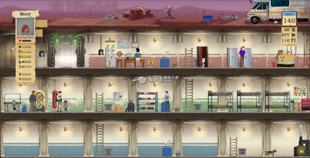 3、经营要素多样:需要经营避难所,保证其安全舒适,合理分配任务,创造家具和武器。还能派出成员探索收集资源,雇佣外来者融入家庭。
