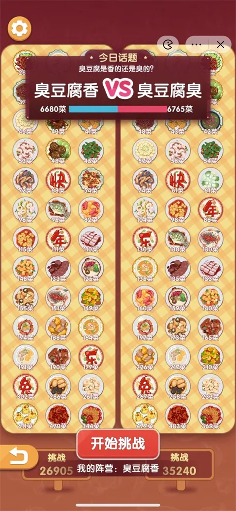 3、阵营对抗丰富:在今日话题板块中,玩家可以选择阵营进行挑战,通关后为自己的阵营增加1道菜,零点前菜数多的阵营获胜,同时每次通关还能获得皮肤奖励,增加了游戏的趣味性和玩家的参与度。