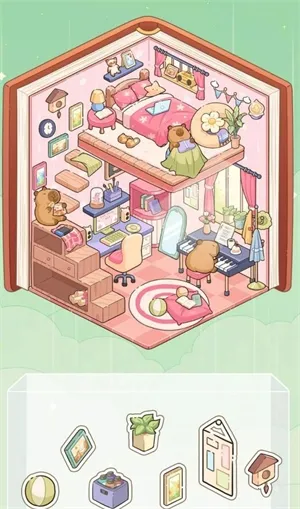 DIY贴纸温馨小屋是款温馨治愈小游戏,以卡皮巴拉为背景角色。玩家摆放不同贴纸装饰小屋,各关玩法不同。操作简便,上线即玩,有大量贴纸、多样场景,能让玩家享受装修快乐,感受萌趣与解压。