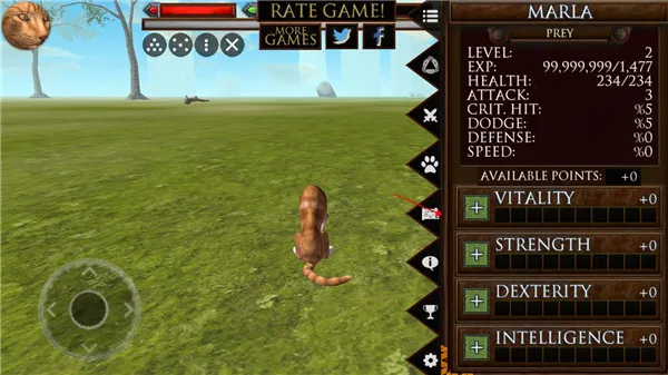 2、丰富玩法体验:玩家要通过捕猎小型动物生存,同时小心大型动物攻击,带来出色的游戏体验。新手进入游戏经验拉满,还有无限经验可自由加点,还能更换猫咪外观形象。